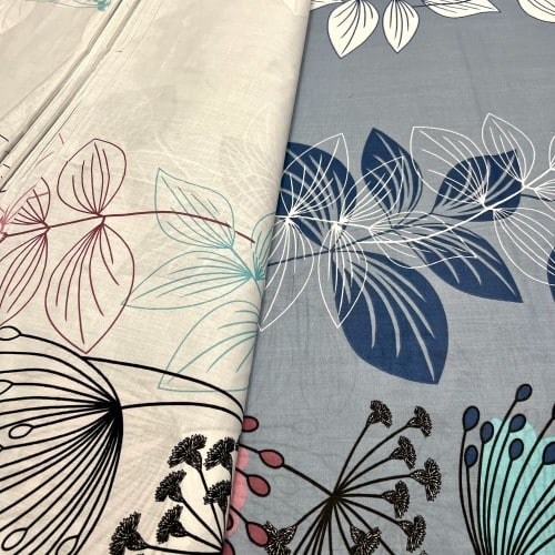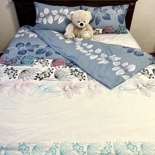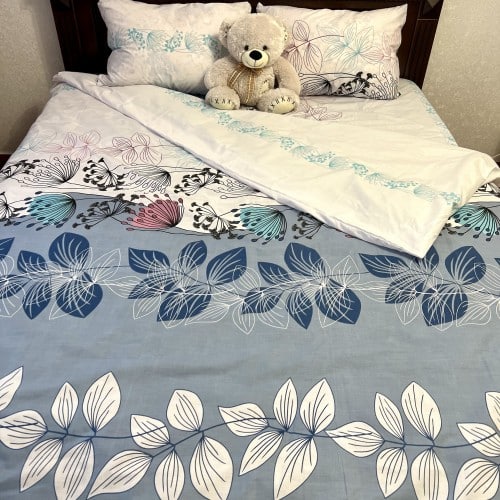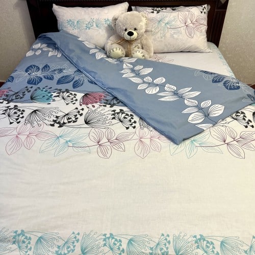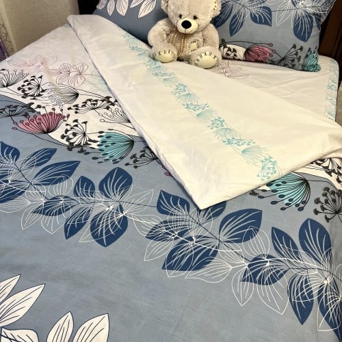 Pościel Beżowo Złota Kwiaty i liście na biało-niebieskim tle Euro